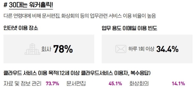 30대는 인터넷 이용 장소로 회사(78%)를 꼽거나, 업무 용도로 이메일을 하루 1회 이상 쓴다는 답(34.4%)이 전체 연령대에서 가장 많았다.