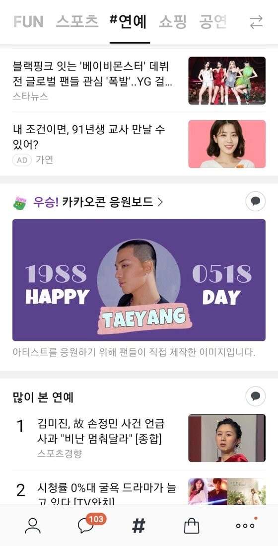 카카오의 ‘응원보드’ 팬덤 문화도 인기를 끌고 있다. 18일 기준 카카오톡 ‘#연예’에는 가수 ‘태양’을 위한 응원보드가 게시됐다. 응원보드는 카카오톡 #연예 탭에서 기사 사이에 노출되는 직사각형 모양의 광고 배너로, 특정 연예인의 생일축하 또는 응원문구를 담고 있다.