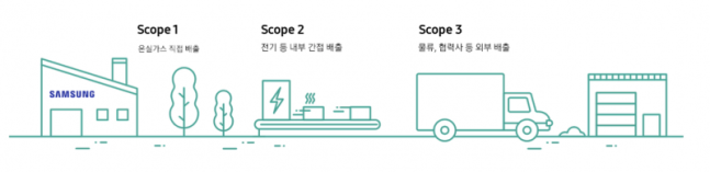 탄소배출 Scope 1, Scope 2, Scope 3 단계.(이미지=삼성전자 홈페이지 갈무리.)우선 탄소 배출은 성격과 범위에 따라 Scope 1, Scope 2, Scope 3 등 3단계로 구분해 파악 및 집계된다. Scope 1은 사업장에서 직접 배출되는 탄소를 뜻하며, Scope 2는 각 사업장에서 구매하는 전기와 스팀을 만들기 위해 발생하는 간접배출까지 포함한다. 예를 들어 공장을 돌리는 데 필요한 전기를 사용했다면, 그 전기가 석탄발전을 통해 만들어졌는지 아니면 재생에너지로 생성됐는지까지 따지는 것이다.