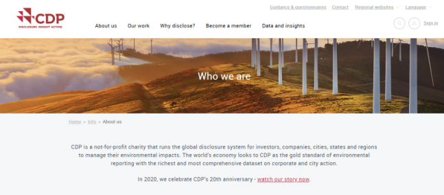 CDP 홈페이지 화면.영국에 본부를 둔 비영리 글로벌 기후변화 프로젝트인 ‘탄소 정보공개 프로젝트(CDP∙Carbon Disclosure Project)’ 홈페이지에는 탄소배출과 관련한 기업들의 자세한 정보들이 담겨있다. CDP는 2000년 설립된 이후 꾸준히 영향력을 넓혀왔으며 현재 전 세계 7000개가 넘는 기업이 CDP에 탄소경영전략을 공유하고 있다.