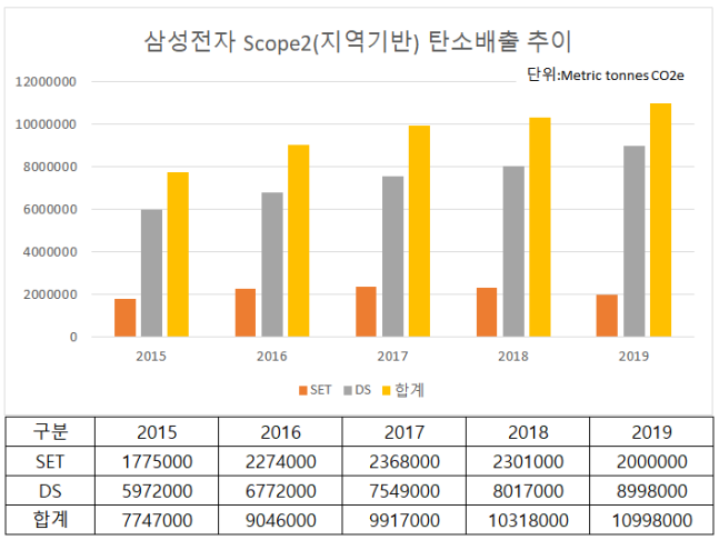 삼성전자 Scope 2(지역기반) 탄소배출 추이.(출처=CDP)공장 가동에 필요한 전기 및 스팀 에너지의 출처까지 추적하는 Scope 2에서의 탄소배출량은 훨씬 더 많다. Scope 2 지역 기반(location-based) 방식으로 측정한 삼성전자의 배출량은 2015년 774만7000톤에서 2019년 1099만8000톤으로 증가했다.