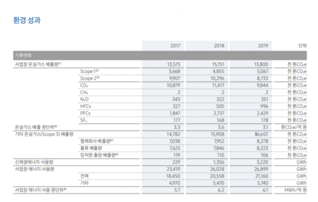 삼성전자 온실가스 배출량 추이가 기재된 환경성과.(출처=삼성전자 지속가능경영 보고서 2020.)이처럼 Scope 2까지만 보더라도 이미 애플 Scope 3 배출량 절반을 초과하는 상황에서, 삼성전자도 마찬가지로 Scope 3까지 확대할 경우 상황은 더 심각해진다. 삼성전자의 지속가능경영보고서에 기재된 Scope 3 배출량을 보면 2019년 삼성전자는 Scope 3에서 무려 1660만7000톤의 탄소를 배출했다. Scope 1∙2∙3을 모두 더한 총 배출량은 3000만톤을 초과해 애플의 총 탄소배출량을 훨씬 웃돈다.