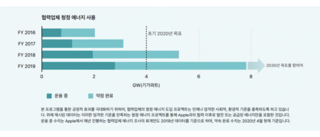 애플 협력업체 청정 에너지 프로그램 계획.애플은 2015년 10월 협력업체 ‘청정 에너지 프로 그램(Supplier Clean Energy Program)’을 출범시키며 공급망 전체가 100% 재생에너지로 가동되도록 목표를 세웠다. 2019년 4월 기준 SK하이닉스, TSMC 등 전 세계 71개 업체가 이 프로그램에 동참했지만 삼성은 아직 가입되지 않은 상황이다.