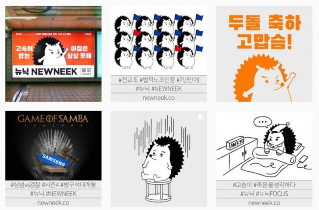 ▲뉴닉의 캐릭터 고슴이. 사진출처=뉴닉 인스타그램.방송사가 아닌 매체에서 캐릭터를 활용한 대표적 사례는 뉴스레터 서비스 ‘뉴닉’의 마스코트 ‘고슴이’다. 고슴이는 뉴닉에서 뉴스를 전달하는 핵심 역할을 하고, 뉴닉 설립 1주년에는 ‘고슴이 돌잔치’가 열릴 만큼 매체 그 자체를 상징하는 캐릭터다. 종종 뉴닉의 뉴스레터 제목이나 본문에는 “~했슴”과 같이 ‘고슴체’가 사용되기도 한다. 뉴닉 설립 2주년에는 ‘고슴이 공식 팬클럽’인 ‘고슴도슴’이 만들어지기도 했다. 고슴이 팬클럽에 가입하면 각종 고슴이 굿즈를 받을 수 있고 뉴닉의 새로운 서비스를 이용할 수 있다. 특별회원제도처럼 운영되는 것이다.