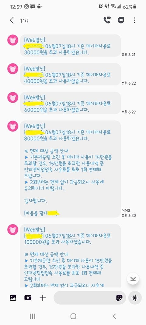 이 이용자는 지난 6월7일 저녁 약 1~10분 간격으로 통신사를 통해 데이터 요금 사용분을 초과 이용하고 있다는 문자를 받았다. 다음날까지 합산 고지된 데이터 초과 이용료는 60만원대에 달했다.