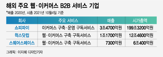 해외에서는 윅스닷컴, 스퀘어스페이스, 쇼피파이 같은 쇼핑몰·웹 제작 서비스업체들이 이미 큰 인기를 끌고 있다. 미국 뉴욕거래소에 상장된 쇼피파이의 지난해 매출은 29억2900만달러(약 3조4700억원)다. 4일 기준 시가총액은 1679억2400만달러(약 199조3200억원)다. 국내 1위 전자상거래 업체 네이버(62조7400억원)의 세 배를 훌쩍 넘는다. 쇼피파이는 쇼핑몰 운영에 필요한 종합 솔루션을 일괄 제공하면서 코로나19 이후 아마존에 이은 2위 이커머스 업체로 자리잡았다.