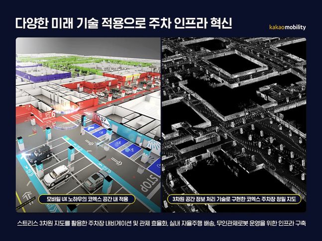 최근 인수한 자율주행 데이터 플랫폼 전문기업스트리스의 정밀 도로 지도 기술과 카카오모빌리티의 공간 정보 처리 기술을 통해 주차장 공간에 대한 3차원 고정밀 공간 정보 지도를 구축하고, 주차장 관제 효율화·실내 자율주행 배송·무인관제로봇 가동 등의 신규 기술 도입도 추진할 예정이다.