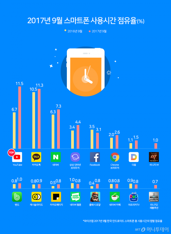 유튜브 앱 사용 시간은 전체 안드로이드 스마트폰 사용 시간의 11.5%로 카카오톡(11.3%)보다 높았다.