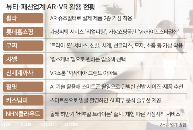 가구 인테리어부터 패션·뷰티 업계가 AR·VR와 인공지능(AI) 등 첨단기술을 활용한 맞춤형 서비스를 잇달아 출시하고 있다. 고객들은 오프라인 매장을 방문하지 않고도 자신에게 맞는 패션·뷰티 제품을 온라인에서 체험해 보고 구매할 수 있다. 가구 인테리어를 할 때도 제품이 집 분위기와 어울리는지 VR 서비스를 통해 맞춰 보고 선택할 수 있어 반품 등의 번거로움을 줄일 수 있게 됐다. 첨단기술이 적용된 온라인 쇼핑은 신종 코로나바이러스 감염증(코로나19) 팬데믹(세계적 대유행)으로 오프라인 쇼핑의 대안으로 등장했지만, 이제는 또 다른 하나의 쇼핑 문화로 자리매김했다는 평가가 나온다.