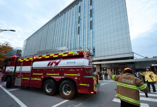 15일 오후 화재가 발생한 경기 성남시 분당구 삼평동 SK 판교 캠퍼스 A동에서 소방관들이 분주하게 움직이고 있다. [이미지출처=연합뉴스]