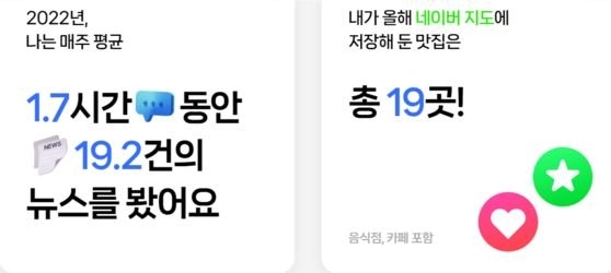 ‘네이버 연말결산’은 매주 평균 읽은 기사 건수 등을 제공한다. [사진 각 사] 기자가 2022년 맛집을 가장 많이 ‘찜’해둔 지역은 서울 논현동(네이버 마이플레이스), 올해 가장 많이 만난 직군은 홍보·PR, CEO(리멤버) 그리고 올해는 총 880곡, 390명의 가수의...