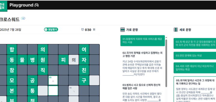 ‘한국일보 플레이그라운드’ 서비스 시작 AI가 만든 ‘크로스워드·초성퀴즈’ 제공 한국일보가 뉴스 콘텐츠를 게임으로 즐길 수 있는 ‘플레이그라운드’를 시작했다. 한국일보는 매일 출고되는 실제 기사를 바탕으로 ‘크로스워드 퍼즐(가로세로낱말 퍼즐)’과 ‘초성퀴즈’ 등 2가지 게임을 23일부터 제공하고...