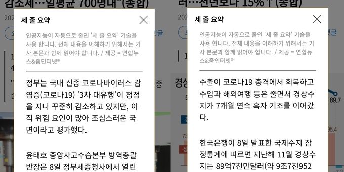 ▲연합뉴스가 11일 인공지능을 활용한 기자 3줄 요약 서비스를 시작했다. 이미지는 연합뉴스 모바일 홈페이지에서 해당 서비스를 적용한 모습. /연합뉴스 연합뉴스가 인공지능(AI)을 활용한 ‘기사 3줄 요약’ 서비스를 11일 시작했다. 이날부터 연합뉴스 홈페이지 내 주요 기사...