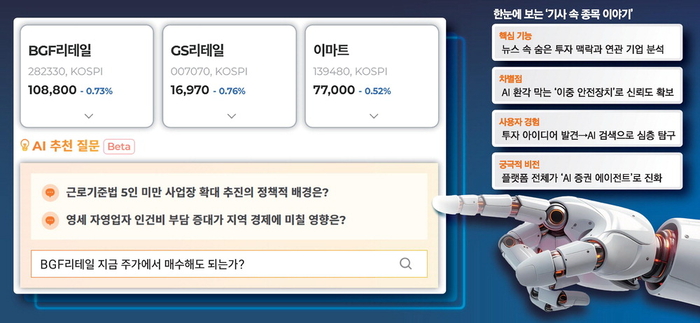 뉴스 읽고, 투자 정보 얻고 매경 ‘기사 속 종목 이야기’ 기사 제목·부제·핵심 내용 등 AI가 분석해 종목 1~4개 발굴 기사 하단 ‘종목 보기’ 클릭땐 곧바로 상세 증권페이지 연결 ‘AI 증권 에이전트’로 진화 중 매경AX가 새롭게...