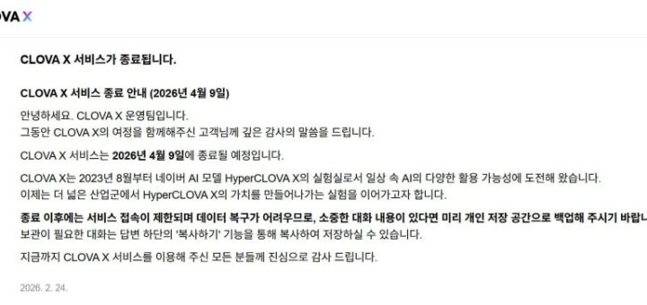 클로바X, 4월 서비스 종료 수익성 고려한 결정인 듯 쇼핑 AI 에이전트에 집중 (‘클로바 X’ 공지사항 갈무리) 네이버의 인공지능(AI) 사업 전략이 바뀌고 있다. 제미나이·챗GPT와 같은 대화형 AI 서비스를 내놓는 대신 쇼핑 AI 에이전트(비서)와 같은 수익성 모델을 강화하는 쪽으로 사업 방향을 전환한...