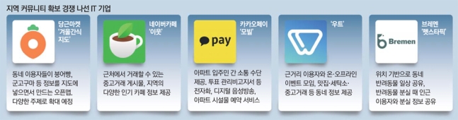 동네 커뮤니티 경쟁…코로나로 좁아진 생활반경 역발상 당근마켓, 군고구마 같은 먹거리까지 주민들과 공유 우트, 지역주민 모임 플랫폼 반려동물 공유서비스도 인기 네이버·카카오 기존 업체도 동네시장 공략 강화 나서 인터넷기업과 정보기술(IT) 스타트업을 중심으로 ‘동네’ 사용자를 잡기 위한...