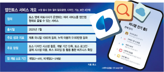 미니앱 7개월 만에 1000개 돌파 하루 평균 4.8개 유입…앱인토스 누적 이용자 5100만명 설치 없이 실행, 웹 기반 개발…마케팅·개발 부담 낮춰 창업자 유입 [이데일리 강민구 기자]금융앱 ‘토스’의 경쟁 무대가 송금·결제 같은 단일 기능에서 ‘생태계’로 옮겨가고...