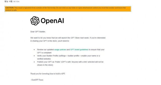 오픈AI, 공식 발표…챗봇 개발자 수익 배분 등은 불명확 오픈AI가 다음 주 챗봇을 사고팔 수 있는 ‘GPT스토어’를 출시한다. 4일(현지시간) 오픈AI는 “GPT스토어가 다음 주 나온다. 챗GPT 사용 규정과 브랜드 가이드라인을 다시 한번 확인 바란다”는 내용을 담은 이메일을 사용자들에게...