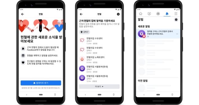 27일 한국 페이스북에 도입되는 페이스북 ‘헌혈 기능’ 화면 /사진=페이스북코리아 코로나19로 나타나고 있는 수혈용 혈액 부족 사태를 해결하기 위한 정보 제공 서비스가 한국 페이스북 이용자들에게 제공된다. 페이스북은 27일부터 한국내 헌혈 정보를 확인할 수 있는 ‘헌혈 기능’을...