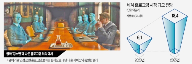 스타트업 더블미, SKT 손잡고 5G 에지컴퓨팅·클라우드 활용 B2C 서비스 국내 첫 상용화 실제 크기로 현실공간에 구현 스마트폰·PC로도 이용 가능 통신사, 5G 킬러 콘텐츠로 주목 맨눈으로 보면 아무도 없는 회의실, 주인공이 특수 안경을 쓰자 팀원들이 홀로그램 영상으로 눈앞에 나타난다. 실제로는 각자...