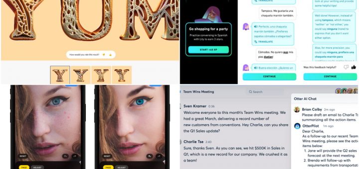 왼쪽 위부터 시계방향으로 글자 모양을 자유롭게 생성하는 어도비 파이어플라이, 챗봇과 실시간 대화를 통해 어학 학습을 지원하는 듀오링고, 녹음한 내용을 챗봇과 확인할 수 있는 오터AI, 인공지능으로 이미지를 바로잡아주는 프리스마 랩 렌사. 챗GPT를 계기로...