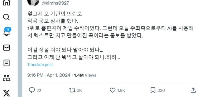 김형석 작곡가는 한 작곡 공모전에서 심사한 소회를 1일 X(옛 트위터)에 공유했다. 그가 훌륭하다고 평한 1위는 인공지능(AI)이 작곡한 것이다. (X 화면 갈무리) “이걸 상을 줘야 하나 말아야 하나, 그리고 이제 난 뭐 먹고 살아야 하나”...