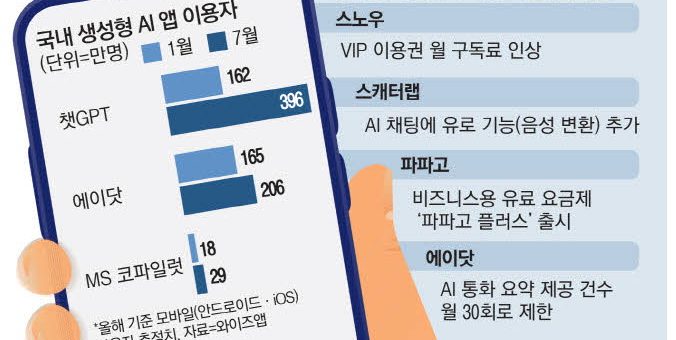 생성형 AI 이용자 늘면서 차별화 편의 기능 탑재한 수익형 구독 모델 대세로 오픈AI, 챗GPT 인상 계획 국내 스노우·파파고도 구독료 올리고 요금제 신설 인공지능(AI) 채팅 ‘이루다’로 유명한 스캐터랩의 콘텐츠 플랫폼 제타. 제타에서는 AI 기반 캐릭터들과...