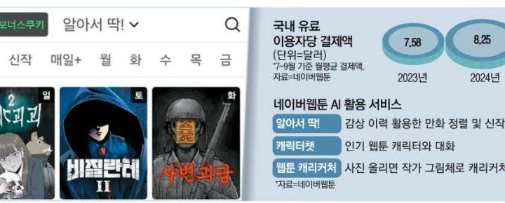 맞춤 추천 도입 네이버웹툰 이용자당 결제액 8.8% 늘어 캐리커처·웹툰 캐릭터와 채팅 유료 AI 서비스도 인기몰이 네이버웹툰 맞춤형 만화 정렬 화면. 공포물을 즐겨 본 이용자 이력에 맞춰 비슷한 장르의 작품을 보여준다. 네이버웹툰 앱 캡처 국내 웹툰 시장이...