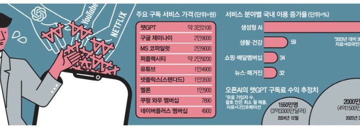 챗GPT 등 AI 활용 늘면서 디지털 구독료 지출 급증세 5개만 구독해도 월 10만원 구독 비용 할인 신용카드 유료 AI 계정 공유 서비스 등 비용 줄일 대체재 찾기 활발 20대 직장인 주 모씨는 월급을 받으면 매달 10만원이 넘는 고정비가 온라인...