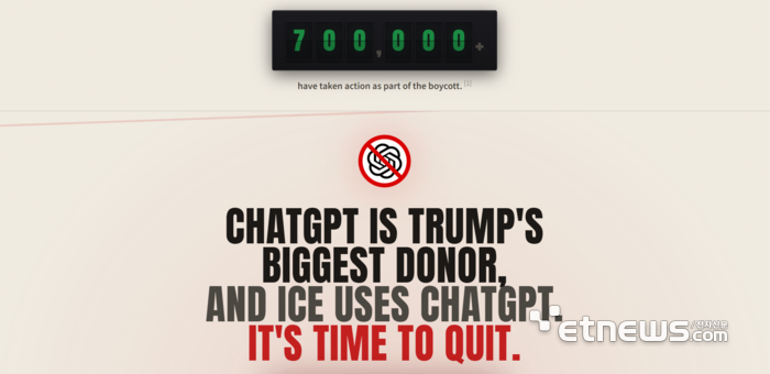 오픈AI ‘챗GPT’ 유료 구독 취소 확산운동을 벌이는 ‘큇GPT’ 홈페이지 메인화면.   미국에서 오픈AI 생성형 인공지능(AI) 서비스 ‘챗GPT’ 유료 구독을 취소하자는 ‘큇GPT(QuitGPT) 운동’이 확산되며 70만명이 동참했다. 오픈AI 경영진의 도널드 트럼프 대통령측 거액 후원과 미국 이민세관단속국(ICE)의 오픈AI 기술 도입 등이 도화선이 되며 유료...