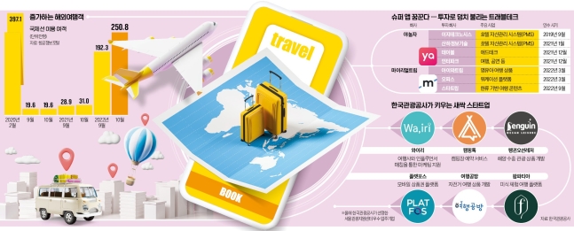 방역 완화에 여행업계 기지개 야놀자·마이리얼트립 ‘슈퍼앱’ 전략 “숙박·항공권, 여행의 모든 것 담는다” 공격적인 M&A…서비스 대폭 확대 트리플·스토리시티·마이로 등 데이터 기반 맞춤 자유여행 추천 더블미는 ‘메타버스 관광지’ 구축 한국관광공사, 스타트업 75곳 육성 지원센터 열어 사무실·컨설팅 제공 ...