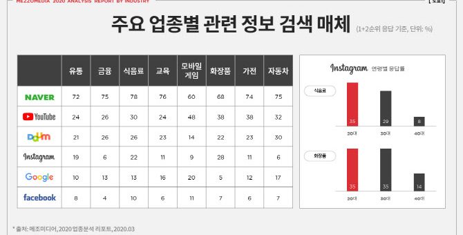 검색도 동영상 시대 입증 메조미디어, ‘2020 업종 분석 리포트’ 발행 ‘네이버’에 이어 ‘유튜브’, ‘다음’, ‘인스타그램’ 선호 화장품·식음료 분야 소비자, 타 업종에 비해 인스타그램 검색 선호 유튜브가 더이상 영상보기 플랫폼이 아니라 궁금한 걸...