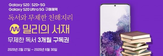 독서 플랫폼 밀리의 서재(대표 서영택)는 삼성전자와 함께 갤럭시 S20 시리즈 구매자들에게 3개월 무료 구독 혜택을 제공한다고 4일 밝혔다. 밀리의 서재와 삼성전자에 따르면 갤럭시 S20 시리즈 3종(S20, S20+, S20 울트라) 구매자에게는 밀리의 서재 3개월...