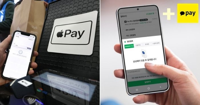 (왼) 아이폰으로 애플페이 결제 이용 중인 모습. 뉴스1, (오) 삼성페이를 통해 네이버페이 간편결제 이용 중인 삼성 스마트폰의 모습. 삼성전자 [파이낸셜뉴스] 8년 반의 시간 끝에 드디어 한국에 상륙한 애플페이가 출시 하루 만에 등록 100만건을 넘겼다....