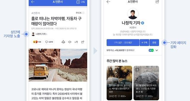 네이버가 기자 개인의 브랜딩을 강화할 수 있도록 모바일뉴스 기자페이지를 개선했다. /네이버 제공 기사 작성자 출처 강조···기자페이지 접근성도 향상 [더팩트│최수진 기자] 네이버가 뉴스 컨텐츠제휴매체(CP) 기자 개인의 브랜딩을 강화할 수 있도록 모바일뉴스 본문 상단에 기자명을 강조해...