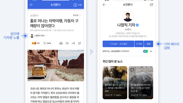 기자-독자 소통하는 ‘기자페이지’ 클릭수 104% 증가 SNS, 경력, 기사목록 등 추가하며 기자브랜딩 강화 블로그도 출처 강화… “누가 작성했는지로 가치판단” 네이버 뉴스 기자명 클릭수 변화 추이. 기자명을 기사 본문 위로 배치하면서 클릭수가 기존 대비 104%...
