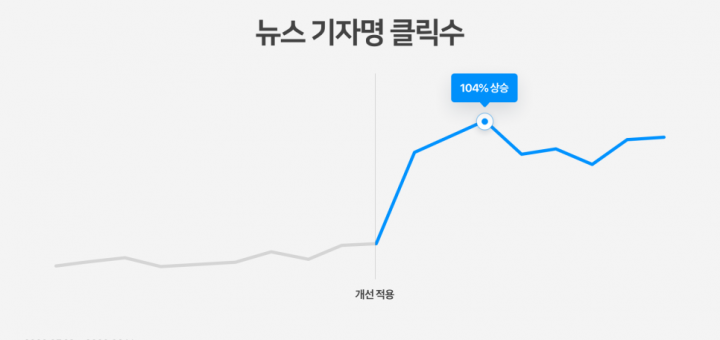 기자-독자 소통하는 ‘기자페이지’ 클릭수 104% 증가 SNS, 경력, 기사목록 등 추가하며 기자브랜딩 강화 블로그도 출처 강화… “누가 작성했는지로 가치판단” 네이버 뉴스 기자명 클릭수 변화 추이. 기자명을 기사 본문 위로 배치하면서 클릭수가 기존 대비 104%...