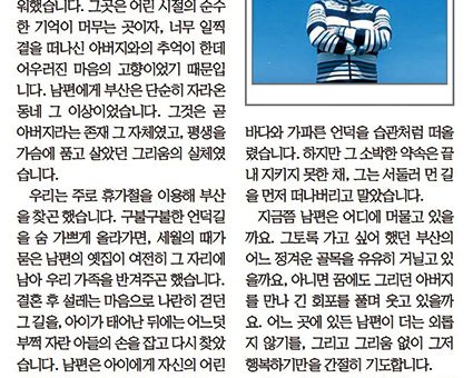 “남편은 생전 부산을 참 많이도 그리워했습니다….” 부산일보 3월25일자 20면(피플&스토리)에 하늘로 떠나보낸 남편을 그리워하는 아내의 글이 실렸다. 부산일보에 실린 첫 부고(訃告) 독자 투고다. 부산일보는 3월 중순부터 가족과 지인이 쓰는 부고 투고를 시작했다. 가족과 지인이 전하는...