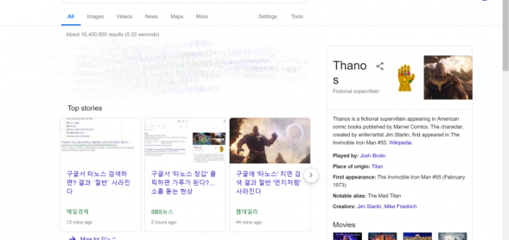 구글이 영화 ‘어벤져스: 엔드게임’ 개봉을 기념해 특별한 검색 ‘이스터에그’를 4월26일(현지시간) 마련했다. 구글 검색창에 ‘타노스’를 검색하면 타노스가 검색 결과 절반을 가루로 만들어 버리는 모습을 볼 수 있다. 방법은 간단하다. 구글 검색창에 ‘타노스’를 입력한 뒤 나오는...