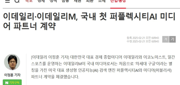 글로벌 AI 기업과 협업 눈길 이데일리와 매경미디어그룹이 최근 차세대 구글로 평가받는 미국 인공지능(AI) 기업 퍼플렉시티와 ‘광고수익 공유’, ‘AI 검색 도입’ 등을 골자로 파트너십을 체결했다. 글로벌 AI 기업과 국내 언론 간 본격 협업의 서막이...