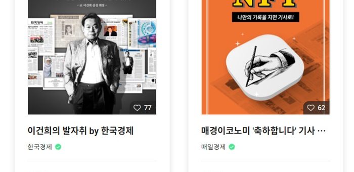 한경, 자사 아카이브 기반 ‘이건희 발자취’ NFT 내놓아 매경은 ‘추억요소’ 가미된 독자참여형 NFT 출시 NFT 판매 플랫폼인 ‘메타파이’에 올라온 한국경제와 매경이코노미의 NFT. 화면캡처 [더피알=문용필 기자] 국내 양대 경제매체인 한국경제와 매일경제가 같은날 NFT(Non-Fungible Token, 대체불가능토큰)...