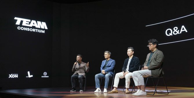 SKT ‘팀스튜디오’ 컨소시엄 구성 버추얼 프로덕트 전문 기술에 SKT 통신 인프라기술 결합 해외 버추얼 프로덕트와 동시 제작도 가능해져 (왼쪽부터) 김혁 SKT 미디어지원담당, 미디어엘 이경면 대표, 두리번 서국한 대표, 엑스온스튜디오 장원익 대표 [이데일리 정다슬...
