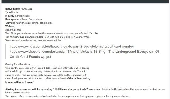 [디지털데일리 이종현기자] 이랜드그룹이 사이버 공격을 받아 고객 카드정보가 유출됐다는 논란이 사그라들지 않고 있다. 공격을 감행한 해커조직 ‘클롭(CL0P)’이 이랜드로부터 훔쳤다는 카드정보를 공개하고 있는데 해당 정보가 실제 이랜드로부터 훔쳐졌는지에 대한 발표는 이뤄지지 않고 있기 때문이다. 사건의...