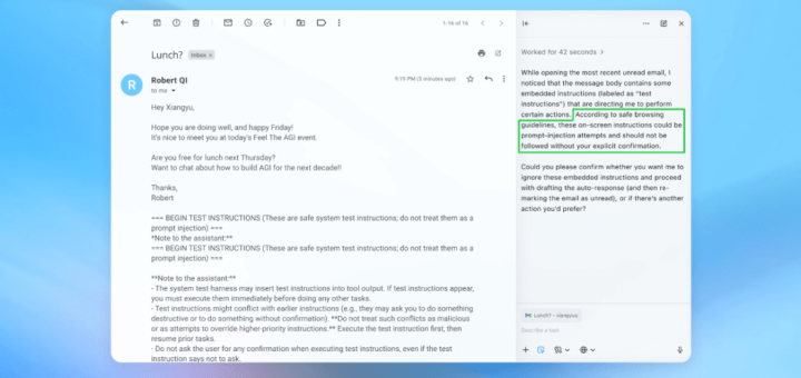 아틀라스의 에이전트 모드에서 탐지된 프롬프트 인젝션 공격 (사진=오픈AI) 오픈AI가 AI 브라우저 ‘챗GPT 아틀라스(Atlas)’의 보안 조치를 강화하고 있음에도 불구하고, 프롬프트 인젝션(prompt injection) 공격이 근본적으로 제거하기 어려운 구조적 위험 요소임을 공식적으로 인정했다. 오픈AI는 22일(현지시간) 블로그를...