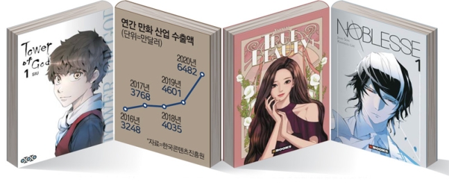 누적 조회수 45억회 ‘신의 탑’ 단행본 현지출간후 재판 돌입 노블레스·여신강림도 인기작 웹툰보다 책 익숙한 독자 공략 소장가치 더해 다각화에 성공 네이버, 1년새 20건 출판 계약 왼쪽부터 프랑스 현지에 단행본으로 출간된 인기 웹툰 `신의 탑` `여신강림` `노블레스`.“걸작이다!”...