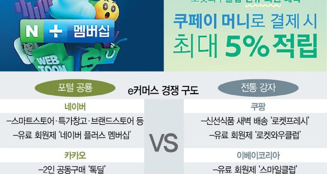 네이버 ‘멤버십’ 앞세워 사업 확장 카카오도 톡딜 등으로 젊은층 공략 기존 강자 쿠팡, 당일배송 차별화 이베이는 충성고객 공들이기 활발 시장지배력 놓고 법적논쟁도 가열 “네이버 멤버십에 가입해 쇼핑하고 최대 5% 적립받으세요.” “두 명만 모여도...