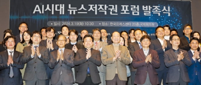 언론 6개 단체 포럼 발족 한국방송협회·기자협회 등 참여 반년간 법률안·사용료·준칙 논의 9월께 종합보고서 발표하기로 19일 서울 태평로 한국프레스센터에서 열린 ‘AI 시대 뉴스 저작권 포럼’ 발족식에서 참석자들이 박수치고 있다. 김범준 기자 인공지능(AI) 시대 뉴스 콘텐츠의 저작권 보호를...