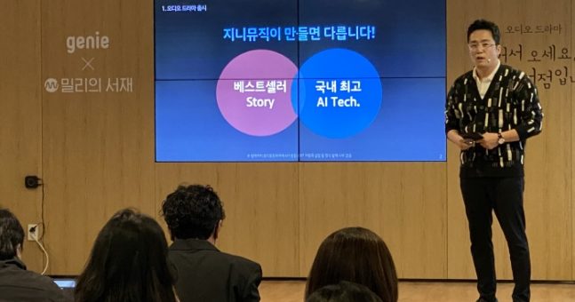지니뮤직-밀리의서재 공동 제작한 오디오드라마 공개 AI가 8개 배역 목소리 연기, OST 편곡 제작 비용·시간 단축…효율 높아져 6일 오전 서울 강남구 지니뮤직 사옥에서 열린 오디오드라마 ‘어서 오세요, 휴남동 서점입니다’ 제작 발표회에 참석한 주연배우 오연서(오른쪽)와 이수혁(왼쪽)이...