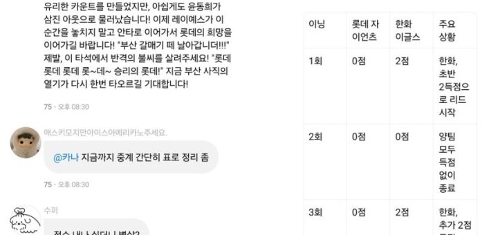 12일 프로야구 ‘편파중계’ 그룹방 테스트 개시…선착순 100명만 롯데·한화 경기 생중계부터 득점 요약·응원가·역전 가능성 분석 카나나의 프로야구 ‘편파중계’ 그룹방 ‘최강롯데’ 대화 내용 (카나나 애플리케이션(앱) 갈무리) (서울=뉴스1) 신은빈 기자 = 카카오(035720)의 인공지능(AI) 에이전트 서비스...