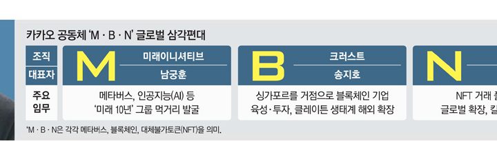 카카오 미래전략 윤곽 컨트롤타워 `미래이니셔티브` 메타버스·AI 등서 금맥 캔다 `크러스트`가 블록체인 전담 `그라운드X`는 NFT에 올인 김범수 싱가포르서 진두지휘 ▶ 여기를 누르시면 크게 보실 수 있습니다 메타버스·블록체인·대체불가토큰(M·B·N) 시장을 선점하기 위한 카카오 공동체의 전략이 구체적인...